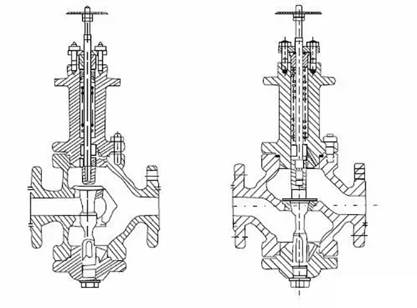 如上所示,給出直通單閥座和直通雙閥座的典型結構,它由上閥蓋(或高溫上閥蓋)、閥體、下閥蓋、閥芯與閥桿組成的閥芯部件、閥座、填料、壓板等組成。